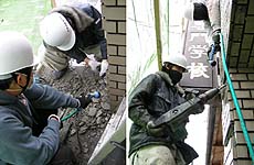 アシスタント・ディレクターのアカサカです。(ニギヤカシではありませんっ!) 目下、ゲート改装チームは小屋組を作成するカネコハン、板壁を作成するオクタハンの2班に分かれて準備作業を進めています。今回はオクタハンの奮闘ぶりを報告させてください。オクタハンにはRC造ゲートのタイルはつりをやってもらいました。ディスクでカットを入れ、電動チッパーではつるという作業ですが、通行人に被害が及ばないよう、仮囲いを作成、ホースで水をかけて埃を押さえながらの作業です。予想よりもしっかりタイルがへばりついていて、なかなか大変な様子でしたが、そこはオクタハン、がんがん行ってしまいました。ゴクローサマ!