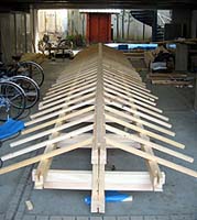 でも、そのヒノキが乾燥に従って癖が出てきて、出桁が曲がっています。真っ直ぐに仕込むのが一苦労です。継ぎ手には車知栓(しゃちせん)を用いて締めて行きます。夕方近くになってやっと垂木(たるき)が納まりました。やれやれ、ご苦労様でした。明日は両妻面に破風板を納めます。ここまで何とか間違いなしでホッとしています。(アカサカ、カツラギ、カネコ)