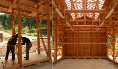 研修棟では、ダブルに入っているすじかいの中央を結ぶ作業を。座屈長さを短くして強度を得るよう、実験で確かめているので、ここでもそうすることにした。1年生の二人に取付作業をしてもらっている間に、付近を散策、森の整備工事を見て歩いた。すこしずつではあるが、手が入って生き生きとして来たところ、自然なしずかさが破られて残念に思われるところ、さまざまである。やがて、強い雨が盛り土を削り流し、元の自然な山に近付けていく。わが管理棟や研修棟はどうなって行くだろうか。