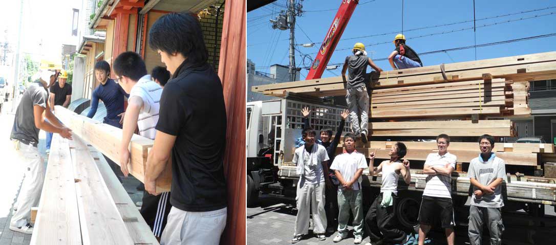 7月31日、いよいよ搬出。材を2台のトラックに載せて、現場に出発。継手で繋いだ7m材もあるので、積み込みは結構たいへんな作業です。京北森林組合のみなさん、ありがとうございました。いよいよ明日から現場で建てて行きます。
