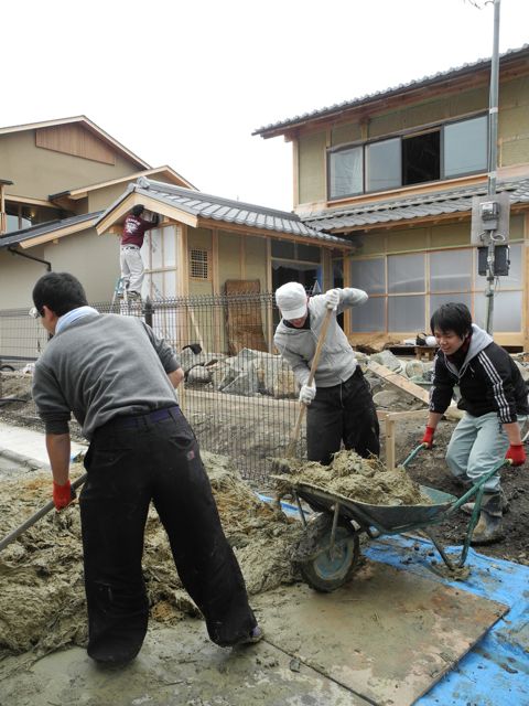 8日にはオカノ君も復帰、事故の怪我もだいぶよくなったようです。オグリ君の補助をやってもらっています。付け送りとは、荒壁土で、でこぼこを均し、厚みをつける塗り作業で、柱の残りのチリ寸法を気にしながら、表面を平らかにして行きます。