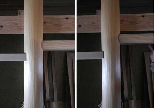 議論し、あれこれ試してみたのが、落し掛けの納め方です。通常は右側にあるように、丸太