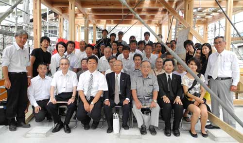 おや、麦わら帽子のこの方は新町通りの「無名舎」主人、吉田孝次郎先生。祇園祭連合会会長でもありますが、もう祭も終わりましたね。お疲れさまです。町家を新築するということで、見に来ていただいたようです。お隣はスイスから日本の伝統建築を学びに留学している怜奈さんと、わが吉田玲奈さん、2人レナで写真。ほかにもたくさんの卒業生たちが駆けつけてくれていました。みなさん、ありがとうございました。