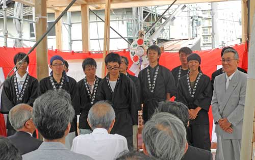 木遣りを唱う京都府建築工業協同組合の役員たち。会長である木村棟梁をはじめ、番匠保存会のメンバーでもあります。こういう声が響くのは気分がいいですね。歌とともに、儀式はクライマックスを終えます。