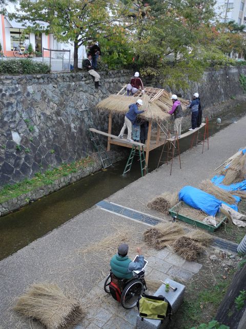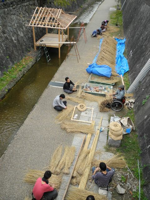 翌31日、午後5時に授業が終わってから、堀川遊歩道にて本組み作業です。その傍らで、京北に稲藁400把を取りに行って来ました。軽トラに山のような量です。作業が終わったのは夜の11時過ぎだったそうです。お疲れさま。