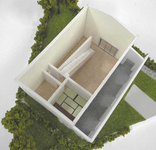 できるだけパブリック対し前向きにアプローチしてみようと思い、グリーンスペースを1つの部屋と考えてみることにしました。そのためにまずそれぞれの個室を完全には区切らず、居間を中心としてすべてに繋がりを持たせようと思い、通り土間、吹き抜け、階段などを使い、全体で緩やかに一体感を持たせることで、グリーンスペースとも違和感なく接することができないかと思い進めていきました。