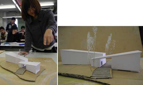 建築科1年生の自由課題 「宝ケ池公園のアートギャラリー」で、各自の草案をスタディ模型で提示してもらいました。みなで思いついたことを話していきます。いくつか、紹介しましょう。