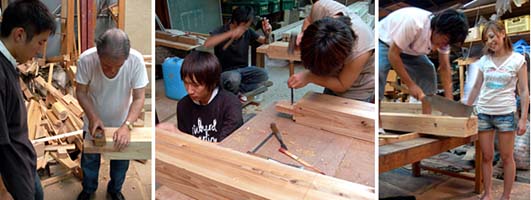 今年の雪で壊れてしまった京北小塩の家の庇をこの夏の木匠塾できちんと作り直そうと、1年生の木工実習授業で木材の刻み仕事を始めています。土台、柱、梁、桁からなる骨組みを伝統的な仕口継ぎ手で組み立てます。木工実習では、これまでに一通りの練習をして来ており、ここからは応用実技編となります。暑い中、棟梁の厳しさも一段とトーンが上がって、皆、頑張って励んでくれました。