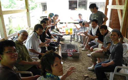 湿っぽく暗い古民家の雨戸を開け、座敷を掃き、雑巾掛けをしてやると、ずいぶん気持ちよくなってきました。次は食事の用意です。持って来た木切れを燃やして、炭を熾します。バーベキューや~!♪