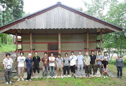 次に、常照皇寺という有名な古寺の近所にある茅葺き小屋の工事現場に行きました。こちらは地元のNPOのみなさんの取り組みで、都市と山村との交流拠点となるのだそうです。NPOのメンバーで学校の卒業生のMさんが説明してくれました。会長のKさんも来られたので、一緒に記念写真です。