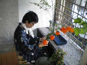床の間は、店舗のショーウィンドウ部分に作成。ラチくんに頼んだ床の間はとっても頑丈に仕上がりました!床の間の仕上げにはかなり悩みましたが、涼しげな砂利敷きに決定。内部に小舞竹を編み、外壁で丸窓をあけたので、下地窓のような雰囲気に!お花部さんにお花をかざってもらった床の間は、とても立派なものになりました。