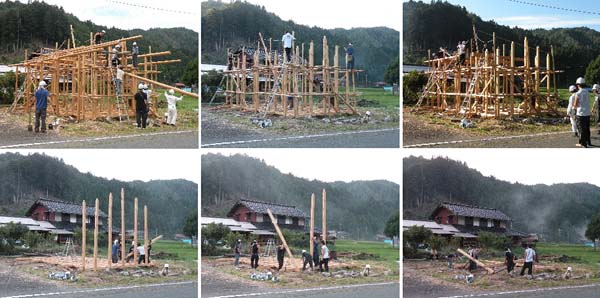 1年リーダーのイナガキです。23日、京北小塩での木匠塾も最終日を迎えています。今年は新型インフルエンザ休校の影響で、25日から学校が始まってしまうため、どうしてもこの日の内に仮組を完成させ、解体して撤収しなくてはいけません。