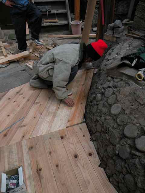 作業はほとんどタダ君がしてくれて、僕はほんのお手伝いです。暮の寒い中、一日で予定された作業を無事終えることができました。複雑な形でどうなるかとはらはらしましたが、そこはサノ先生とタダ君、次々と進めていきます。さすがだな~、僕はいつになったらそんなことができるようになるんだろう?出来上がった厚板のステージ、なかなかよく出来ていますよ。場所が場所だけに、ちょっと皆さんに見て頂くことはできませんが、ご主人さんも喜んでくれました。日も陰るころ、嬉しく片づけて引き上げて参りました。次はその横の通路の木戸をこしらえるそうです。これも楽しみです。(東京出身のマツシマでした)