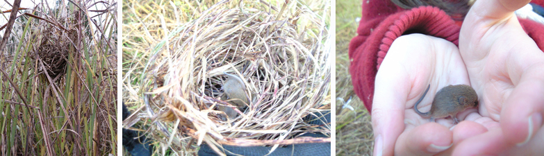 サノ先生が、茅ネズミの巣だよと教えてくれました。中を覗いてみると、空っぽ。大抵は空の巣だそうです。その内、あちこちに巣が見えて来ます。あ、ネズミ発見!親指の先ほどもない小さく可愛らしい茅ネズミのです。本当に可愛い!これだけでも、今日、来た甲斐がありました。