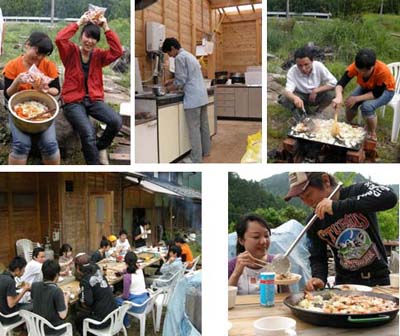 小塩に着いて木材を降ろし、家の中を一度ダニ退治の薬を焚きます。シュラフを干し、夕飯の用意。夕食はめぐさんが料理長で、リゾットを。京の料理店からいただいた鶏スープを用いたリゾット、白ワインも効かせて、まずまずの出来でした。ちょうど明日の下小屋のために用いる足場丸太を三間さんが届けてきてくれましたので、一緒に戸外で夕食会です。日中は暑かった小塩も、日が沈むと涼しい風が吹いて、とても気持ちがいいす。京都の地獄のような熱っぽい暑さとは別世界!さあ、明日から木匠塾前半の部、本番です。みなさん、よろしく!(1年リーダー スケタでした)