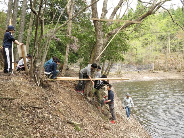 食後、また現場に向かって、実際のデッキを受ける桁の位置と、柱の長さを実測しました。今日は池の水がずいぶん減ってましたな。
