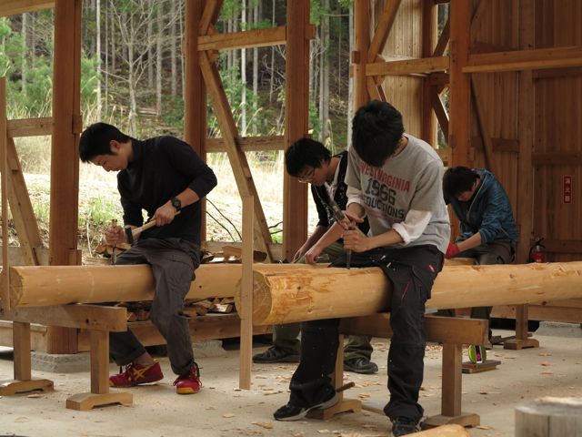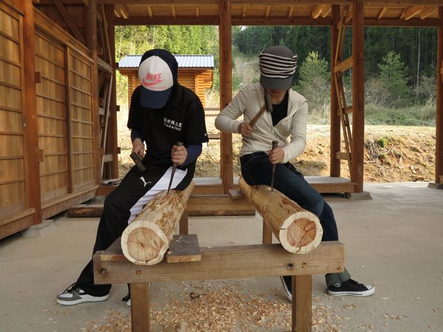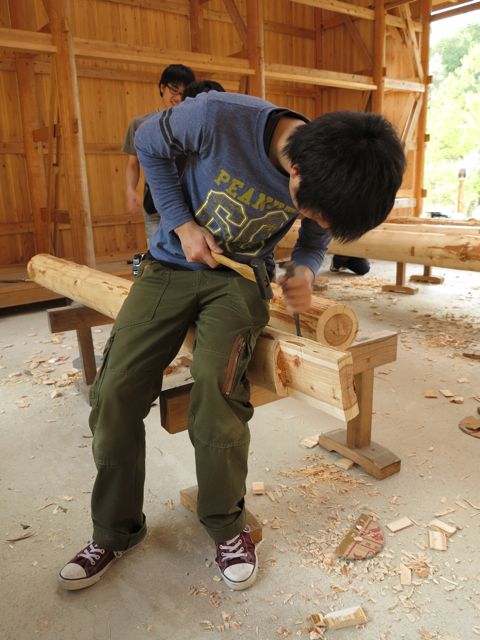 丸太の墨付けを教わった生徒たち。墨をつけて、ほぞ穴開けを。生に近いひのきなので、気持ちよく彫れます。この日はここまで。次回、連休後半には、つづきと、柱のほぞ、ヒカリつけに挑戦です。