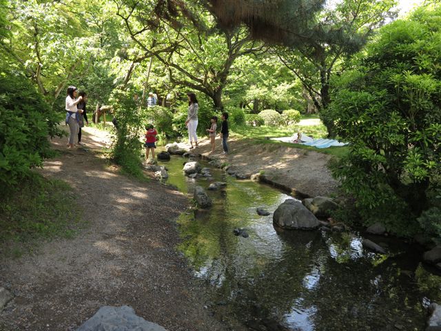 御苑の木立の中を流れる小川に、子どもたちが楽しそうに遊んでいます。