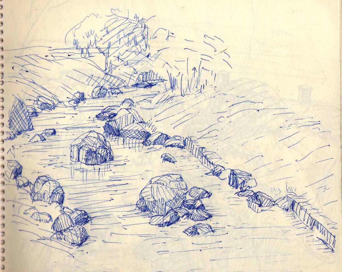 水面と石の表情を描いていると、楽しくて時間がたつのを忘れます。