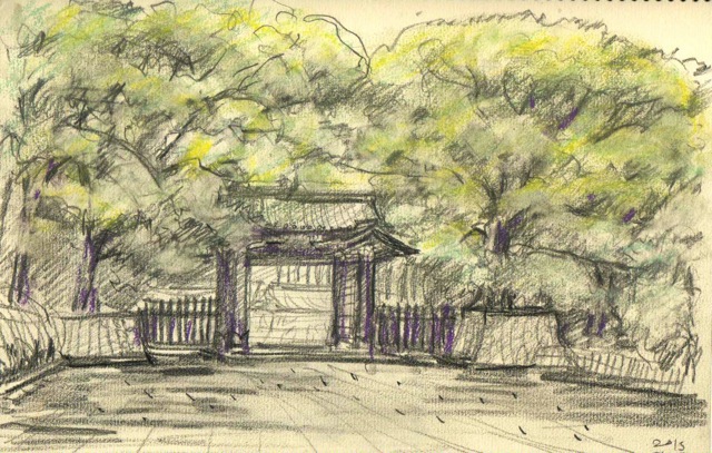 これは帰りがけに描いたもの。下立ち売り御門のあたりには、今が盛りのクスノキが燃え立つように大きく黄緑色に聳えています。家に帰ってから、パステルで軽く色を付けています。本当はもっと建築を引き立てるように描かねばならないのですが、。。今度はもっと大きなスケッチブックを持って来て描いてみます。