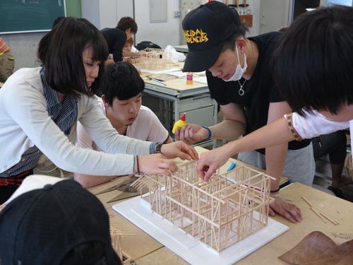 5月のさわやかな風が製図室を吹き抜ける中、1年生がグループに分かれて構造模型を作製しています。図面を見ながら指示を出す人、ひたすら削る人、チェックしながら組み付ける人、ぼお~っと見ているだけの人、さまざまです。4月に入学したての頃の緊張感もようやくほどけて、わいわい楽しく作業できる幸福な時間です。