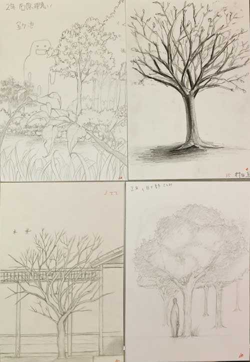 さのです。学校では折々、樹のスケッチを描いてご覧と生徒たちに勧めています。授業でも、近くの京都御苑にみんなで行って、樹を描く練習をしますが、面白いことに、同じ樹でも人によって描かれる姿がずいぶん違います。みんな違うところがいいですね。