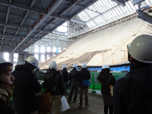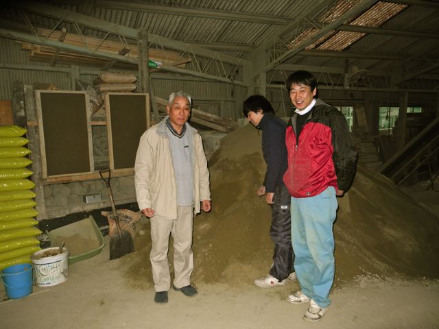 親子さんで経営されている尾崎さんの工場には10年ほど昔に来て、今回が2度目です。前はもっと忙しそうだったな、。。と思いながら、いろいろな京都の土のお話を伺うことができました。今回の版築には、きれいに出来上がった壁土製品ではなく、原土に近いものをお願いすることに。
