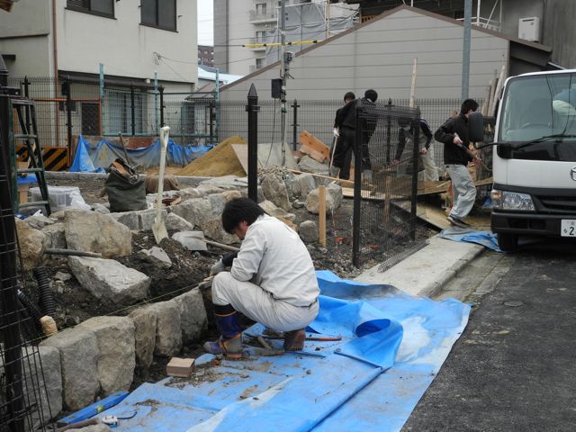 作業している隣では、道路との境に見地石を積む作業が行われています。足元にころがっている見地石が危ないので、この際、ちゃんと積んでしまおうということで、造園仲間が手伝いに来てくれました。版築の基礎の石と並んで、いい風情になることでしょう。