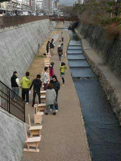 2月17日、木工基礎という実習授業でおこなっていた椅子作品の発表採点会の日です。製図室に椅子を持ち寄ってサノ先生を待っていましたが、先生、現れるやいなや、「外でやろう!」と。皆でめいめい自分の作品を持って、学校の横にある堀川公園に行きました。まるでアリが食べ物を運んでいるような面白い行列風景。通りの人も何が始まるんだ?と不思議そうな表情でした。
