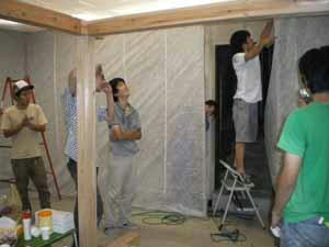 ちょっと休憩をはさんで、さて、後半の部、いよいよ荒壁塗りです。町家の向かいは町内の地蔵盆祭りの真っ最中。賑やかに提灯を下げて、近所のお年寄りがにこにこ迎えてくださいます。来年はみんなで地蔵盆に参加しようか?
