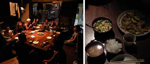 小塩の宿舎にもどって、皆でご飯!この日は掻き揚げ丼と夏野菜の炒め物、みそ汁とご飯。ほかにはキュウリのサラダでした。料理長はオ〜バさん。いっただきま〜す。(おいしかったです)