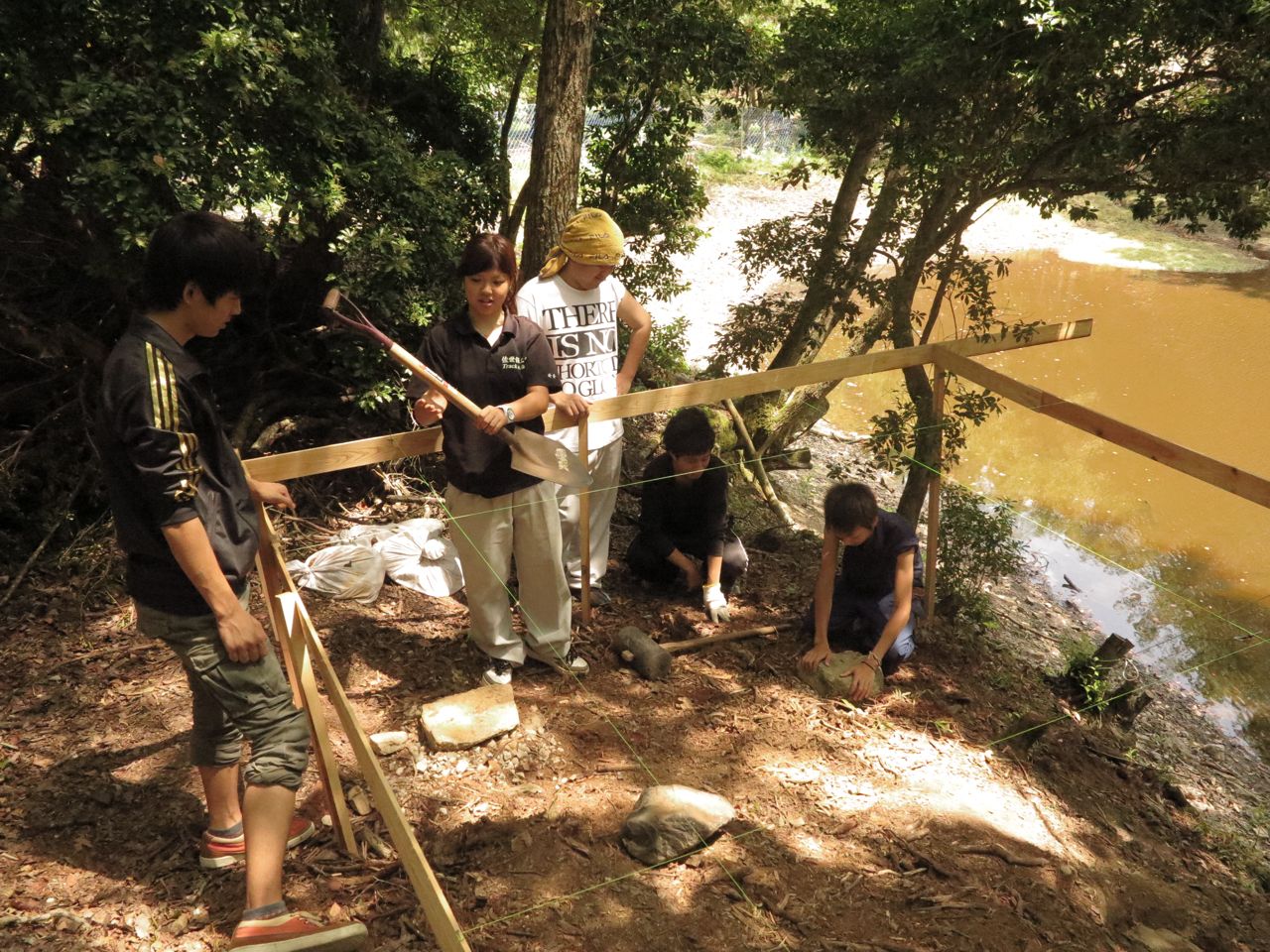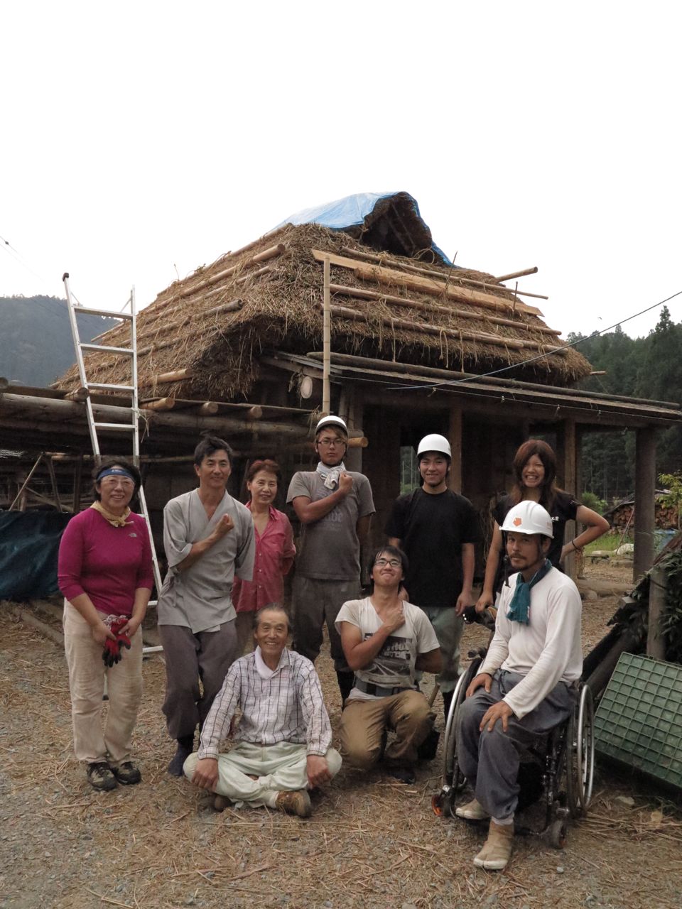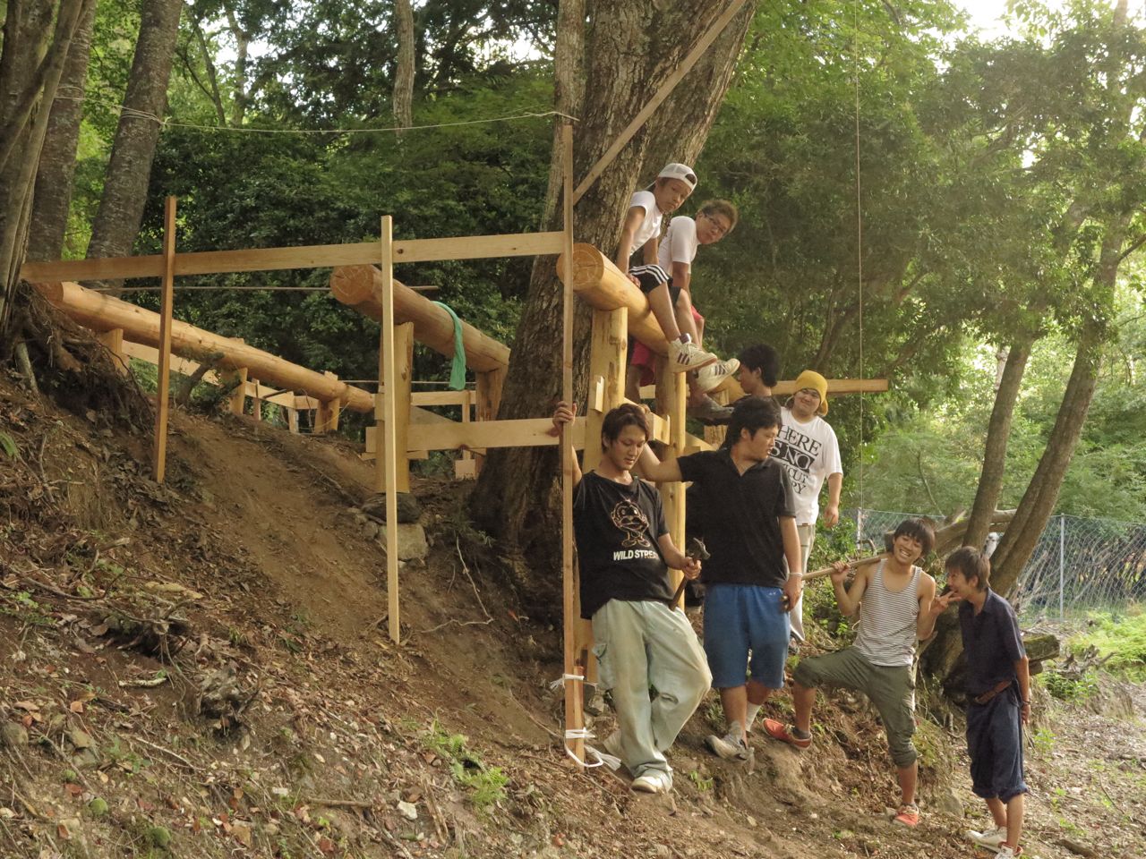 やったー、完成っす!桁が樹に当って、ちょっと柱が曲がっているけど、そこは身体で見えないように隠して記念写真ん〜。♪ 後で基礎石を組み直すことにしましょう。うちらにはもう限界っす。崩れてしまうし。先生、モルタルで留めましょうって。さあ、片付けて引き上げ!お茶飲みたい!