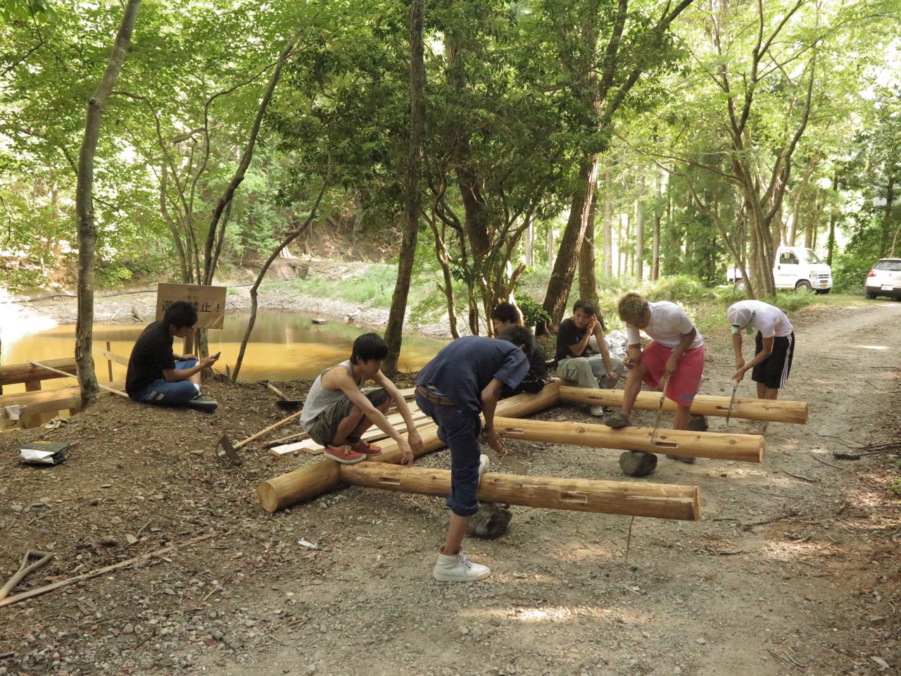 とにかく暑いので、ちょっと作業したらお茶を飲みます。竹やら丸太やらを倉庫から引っ張り出し、休憩。去年に鉾杉塾さんがつくられた小屋はちょっと涼しく、どくだみ茶が美味しかったです。ありがとうございました。