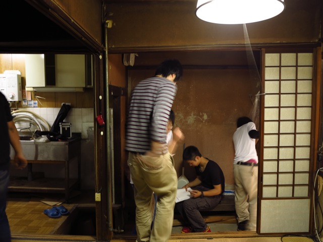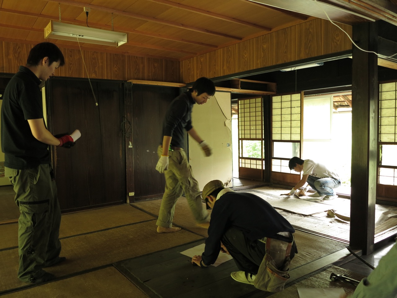 手分けして、平面図を取るための実測作業に入ります。内壁の上にベニヤを張っている部分はわかりにくく、苦労しました。断面は佐野先生が取ってくれています。多田先生は傷んだ箇所の床をめくって床下の様子をみるという作業をやってくれています。実測結果を持ち帰り、CADでまとめる予定です。