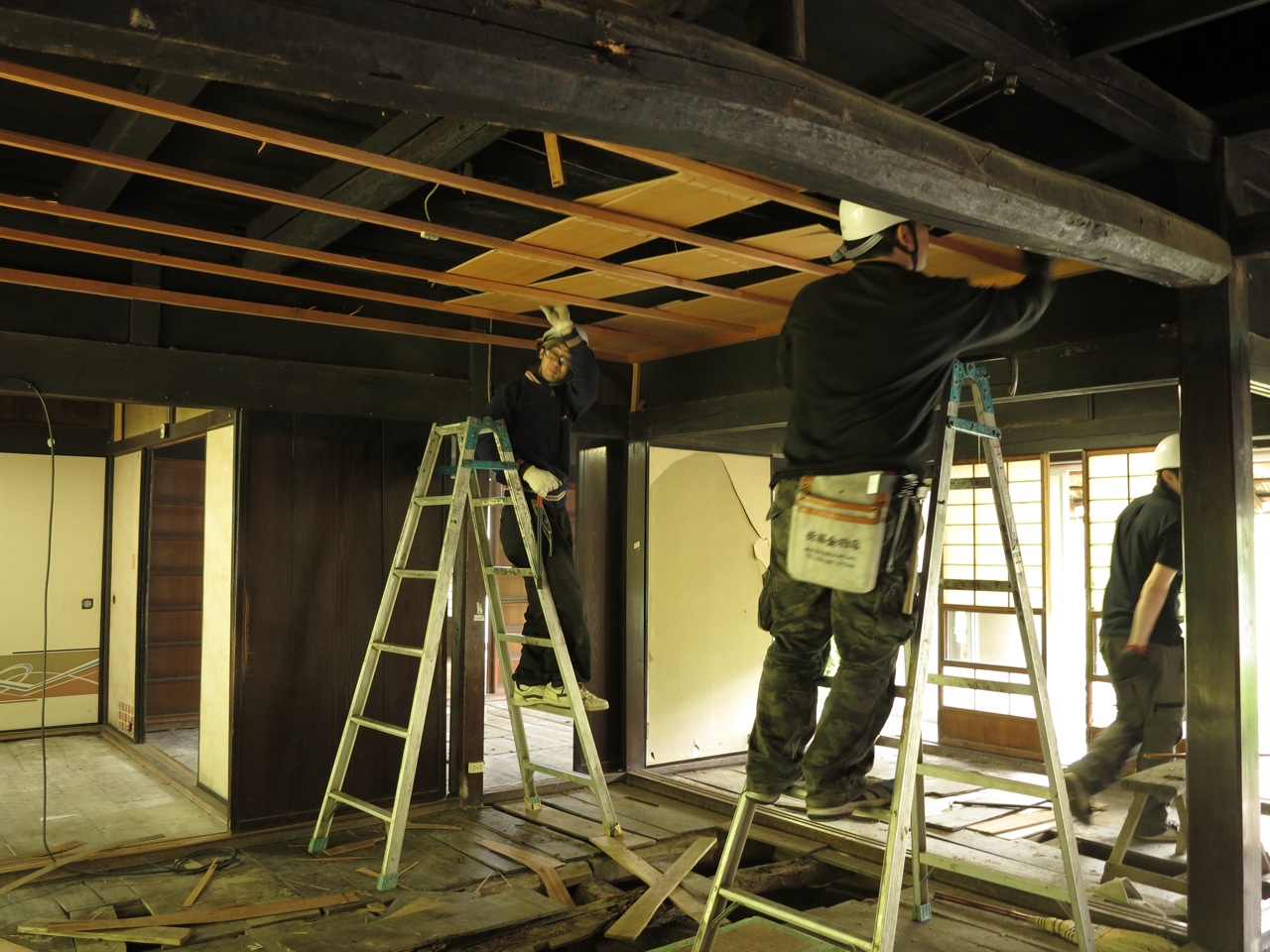 写真は畳に番号をつけて運び出しているところです。畳をとると、床組みがあらわれて来ました。大引きは意外にしっかりしていたものの、根太は一部朽ちていて、新しく取り替えることにします。