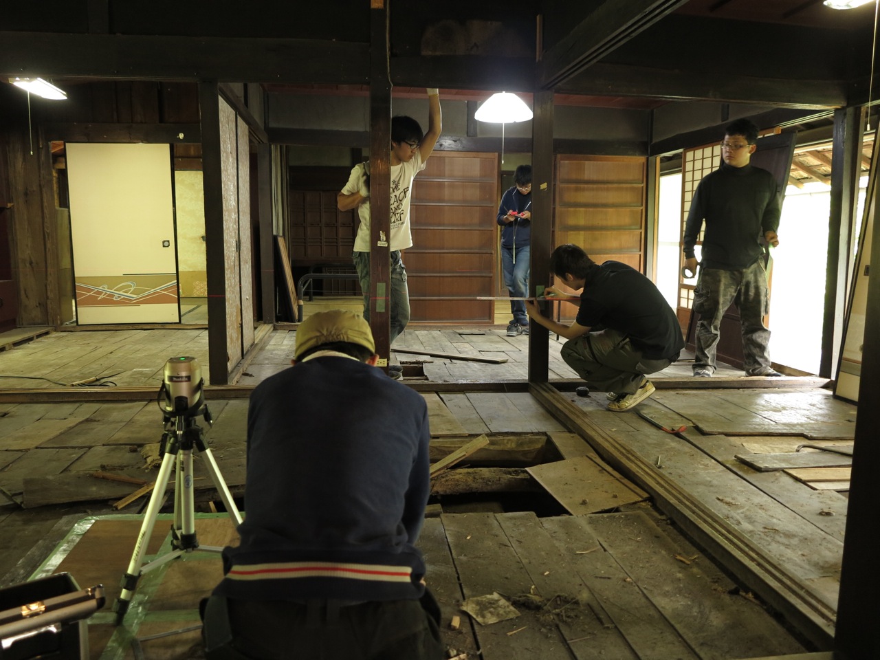 写真は畳を上げて、レーザーを使ってレベルを調べているところです。