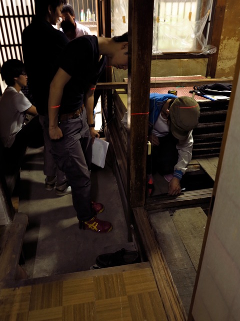 この写真で多田先生が測定している柱は小黒柱と呼ぶのだそうですが、ずいぶん細いものです。北に2mほどの柱と比べて5cm沈下しているとわかりました。南隣の柱が隣家と共通の柱なので、一緒に上げることができません。この5cm下がっている柱に合わせて他の柱を下げるというのも一つの方法ですが、あまり健全ではないそうです。