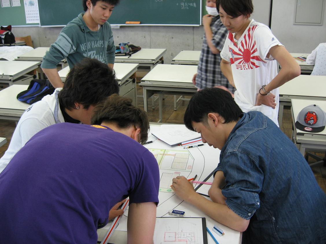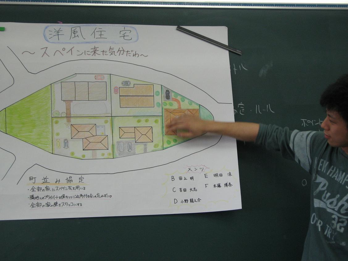 今日の設計の時間は、自由課題「住宅の設計」で6戸からなるまち並み協定をグループごとに発表しました。午前中、大きな紙に、まち全体を家の屋根伏せと庭を描きこんで行きます。