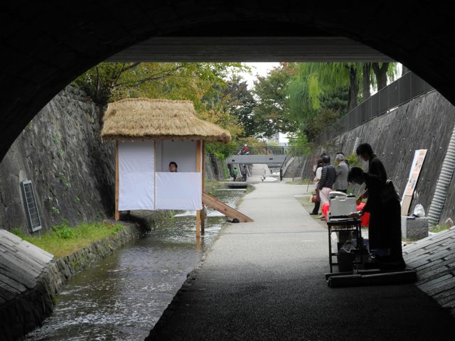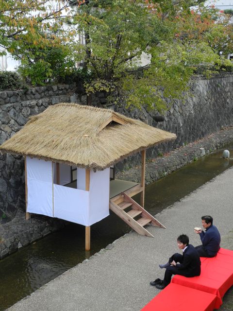 食後、片付けをして、ご近所にお餅を配り、皆で堀川遊歩道のお茶室の前に集合。