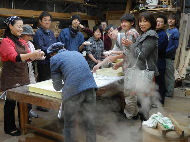 建工祭3日目は恒例のおもちつき。朝から餅米をふかして石臼で搗いていきます。今年はすべて1年生がやってくれています。