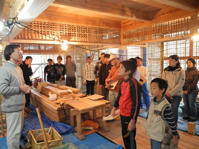 北村さんは15年前の卒業で、京都のゼネコン(建設会社)に勤めた後、家の工務店に移られました。現在は木造住宅を主に仕事をされています。今年の春に完成見学会の家でばったり出会って、今回のミニレクチャーをお願いしたものです。天然乾燥材や自然素材といった最近の良心的な木造の家づくりを手がけるだけあって、まじめで信頼される人柄がにじみ出ていると、生徒たちの感想です。