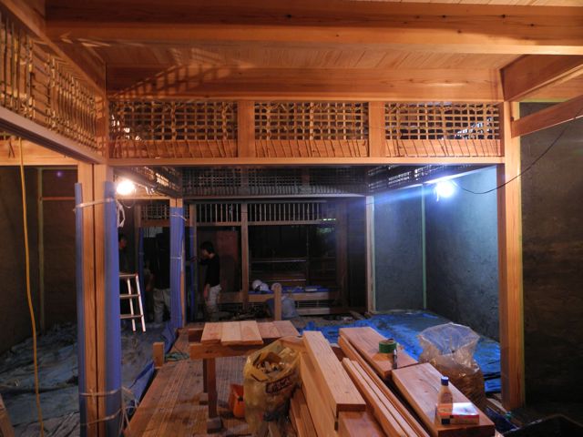 う〜ん、お茶の先生らしき方が入られていますね。大丈夫かな〜。森田君なら落ち着いて捌けるでしょう。正面から見てもなかなかきれいな屋根です。破風の辺りをもう少しきちんとすれば、言う事無し。庵名を掲げてもよかったですね。