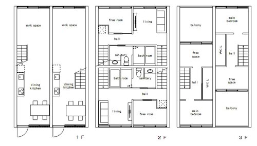 また、職住一体タイプも設計しました。居住者はものづくりや、アート等、人に魅せる職業や趣味の方。または外部の方にアピールしたいことがある方と設定しています。ワークスペースを街路側に設けることで、作業工程をプレゼンテーションすることができます。ギャラリーを設けたので、そこで個展を開くことも可能です。