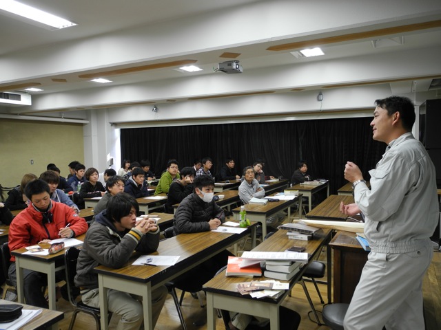 後期には1、2年合同の授業、建築概論があります。その中で様々な建築関係職にある卒業生たちにミニレクチャーをお願いしています。今年は工務店から北村篤史さんにお越し願いました。