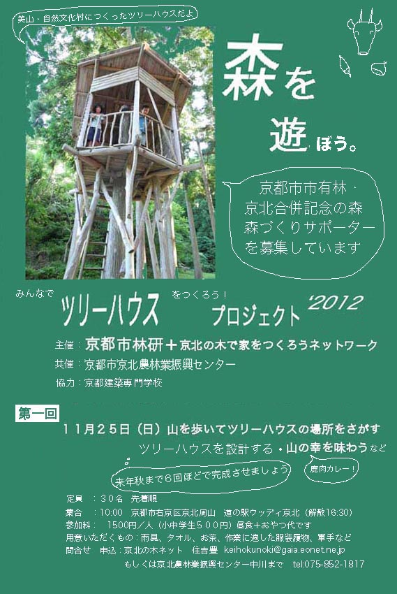 11月25日に京都市京北農林業振興センターさんと共催イベントを行います。森に親しみ、森づくりサポーターを増やして市民の森を育てて行こうというものです。