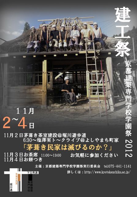 建工祭とは本校の学園祭の名前です。2000年、創立50周年記念を機に成ったよしやまち町家校舎の完成記念として、創立当初に行われていた学園祭を復活させました。昔は学生設計製図などを展示したりしていたようだが、大工見習いらしく、ちりとりなどもつくって売っていたようです。この12年間、ずっと学園祭では、記念茶会を催すのと、お餅をついてご近所に配るということを欠かさずやってきました。4年前からは、堀川が改修され、遊歩道となってから、ここにお茶室をつくって、通る方にお茶を呈してきています。