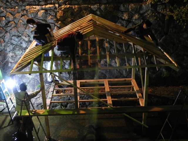 1日も作業は暗くなっても続いています。茶室建築の傍ら、灯籠つくりも行っていました。