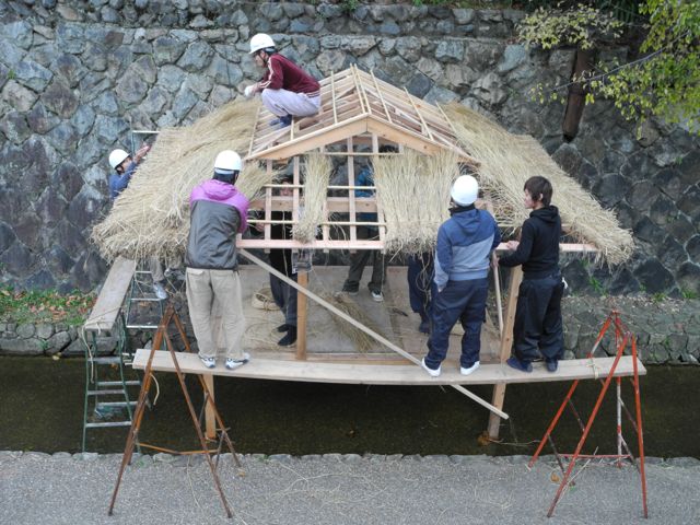翌31日、午後5時に授業が終わってから、堀川遊歩道にて本組み作業です。その傍らで、京北に稲藁400把を取りに行って来ました。軽トラに山のような量です。作業が終わったのは夜の11時過ぎだったそうです。お疲れさま。