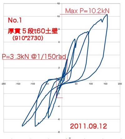 記録したデータをグラフに表示した。 押し引きがー、+となっている。+の側とーの側とで強度がずいぶん異なるのは、タイロッドの懸ける位置がちょっとずれていたことによるのかもしれない。 結果的には、特定変形角に対応する耐力から、壁倍率はかろうじて1.5ほどであるが、ばらつき係数を乗じると、もっと小さい値となる。やはり柔らかめの土を使っていること、塗り方がどうしても大雑把のために、貫回りやちり回りに隙間ができていることによるのだろう。一方、最大耐力は、1t を超えているのだから、立派なものだ。厚い貫が5段に組まれていることによるものと思われる。