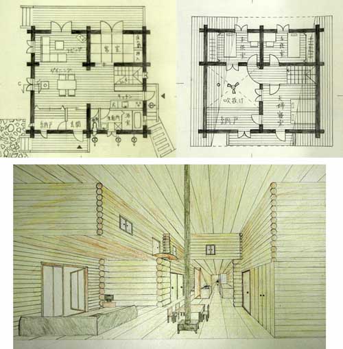 山荘グループということで、ログハウスを設計することにしました。仕切りを少なくし解放感と暖かさを意識しています。